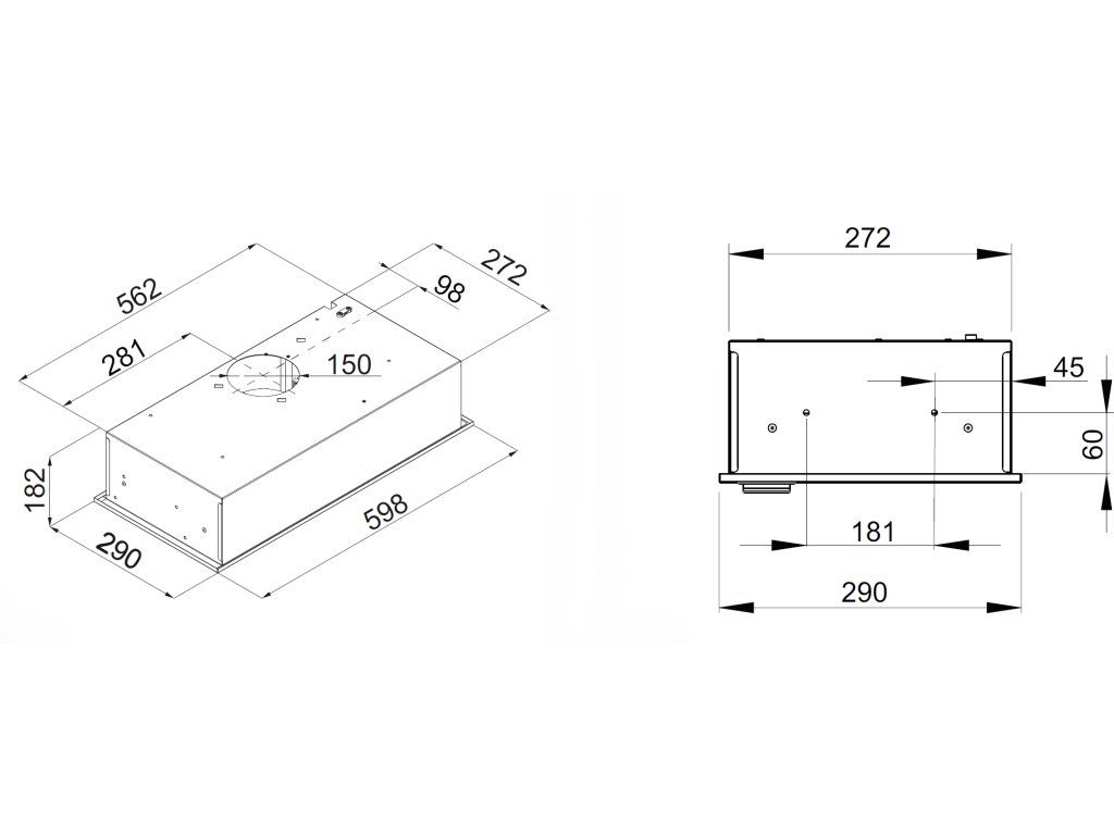 - Vstavaná inštalácia do skrinky ● Priemer výstupu vzduchu: 15 cm