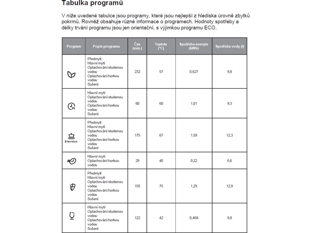 Programy umývania: | 90 minút, ECO, Rychlý 29 min., Intenzivní 67°C, Hygienický 75°C, Jemný 42°C |